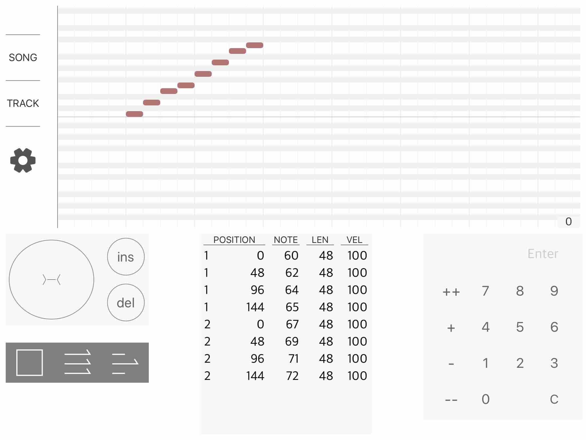 This is a music sequencer using numeric data. This app is for making MIDI data to send to an another app applied to virtual MIDI. iPad only.