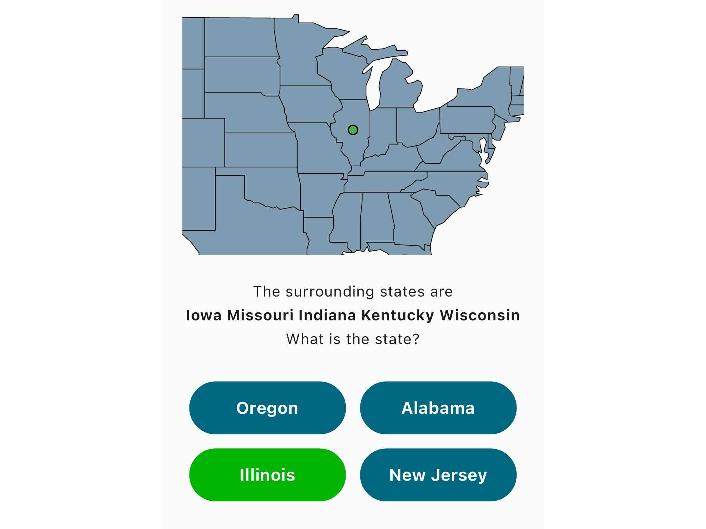 Quiz to guess the state of the United States. The surrounding states are shown. Guess based on that.