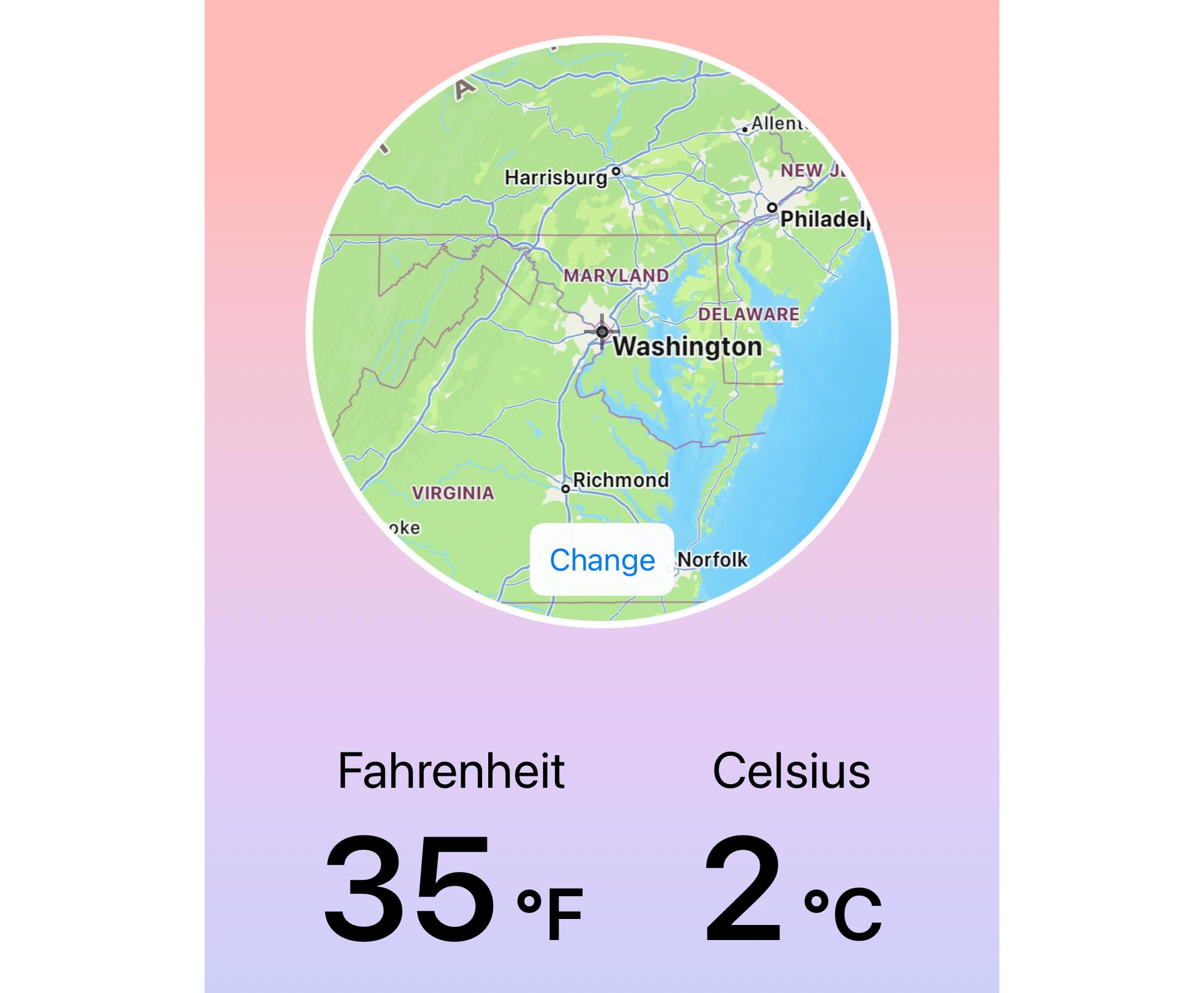 Displays the temperature in both Celsius and Fahrenheit. The aim of the app is to connect the unfamiliar scale with physical sensation.