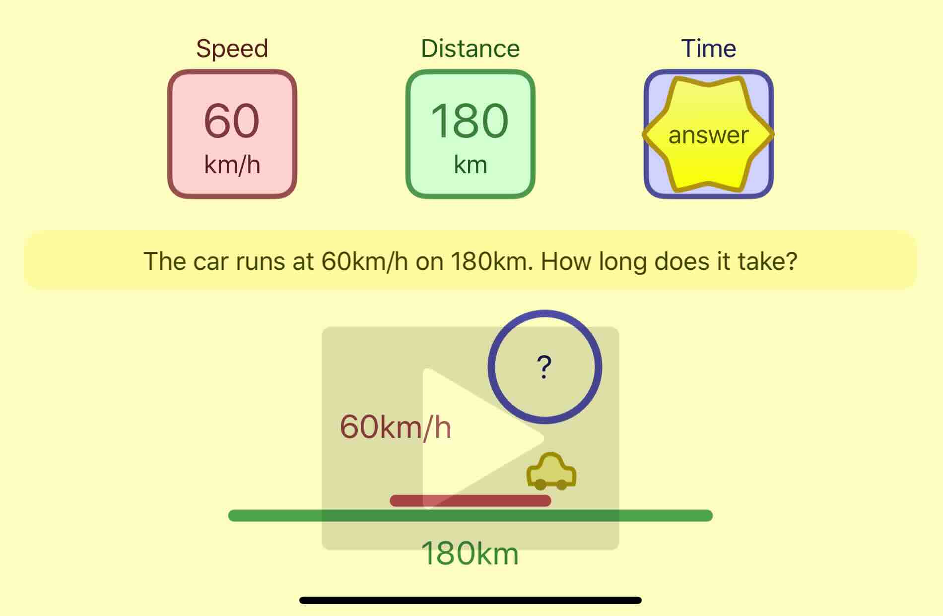 This app helps you learn how to calculate questions about distance, time and speed with animation in which a car is running.